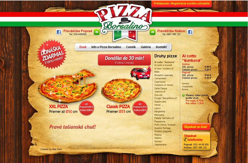 Podpora donášky pizze pomocou online objednávky v lokalitách Košice a Poprad. Prehľad a manažovanie užívateľov, objednávok pre jednotlivé prevádzky a taktiež úplná kontrola nad obsahom webu pomocou Bee Mark redakčného systému.