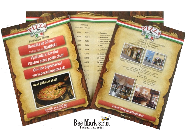 Návrh a tlač promo letáčika zameraného na podporu donášky pizze v mestách Košice a Poprad. Vnútro venované jedálnemu a nápojovému lístku pizzérie. S prípravou Vášho promo letáčika, cenníka, nápojového alebo jedálneho lístka Vám radi pomôžeme. Váš Bee Mark - Reklamná agentúra Košice.
